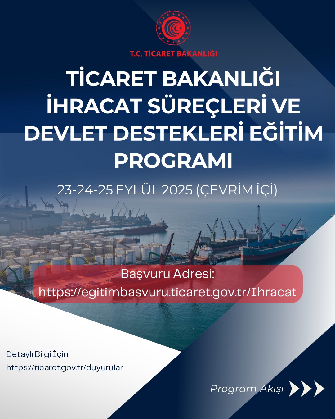 Bu çerçevede, Ticaret Bakanlığı’ndan alınan bir yazıda, Türkiye’deki tüm iş çevrelerinin genel katılımına açık olarak EK-2’de yer alan program akışı çerçevesinde 23-24-25 Eylül 2025 tarihlerinde çevrim içi bir eğitim programının gerçekleştirileceği ve eğitimin en az üçte ikilik kısmına katılım sağlayan katılımcılar adına eğitim programı sonunda dijital katılım belgesi düzenleneceği bildirilmektedir.